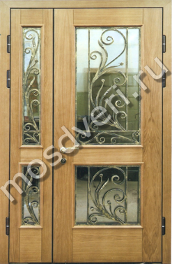 Двупольная дверь из массива с кованными элементами — совмещает эстетичность и превосходные защитные характеристики.